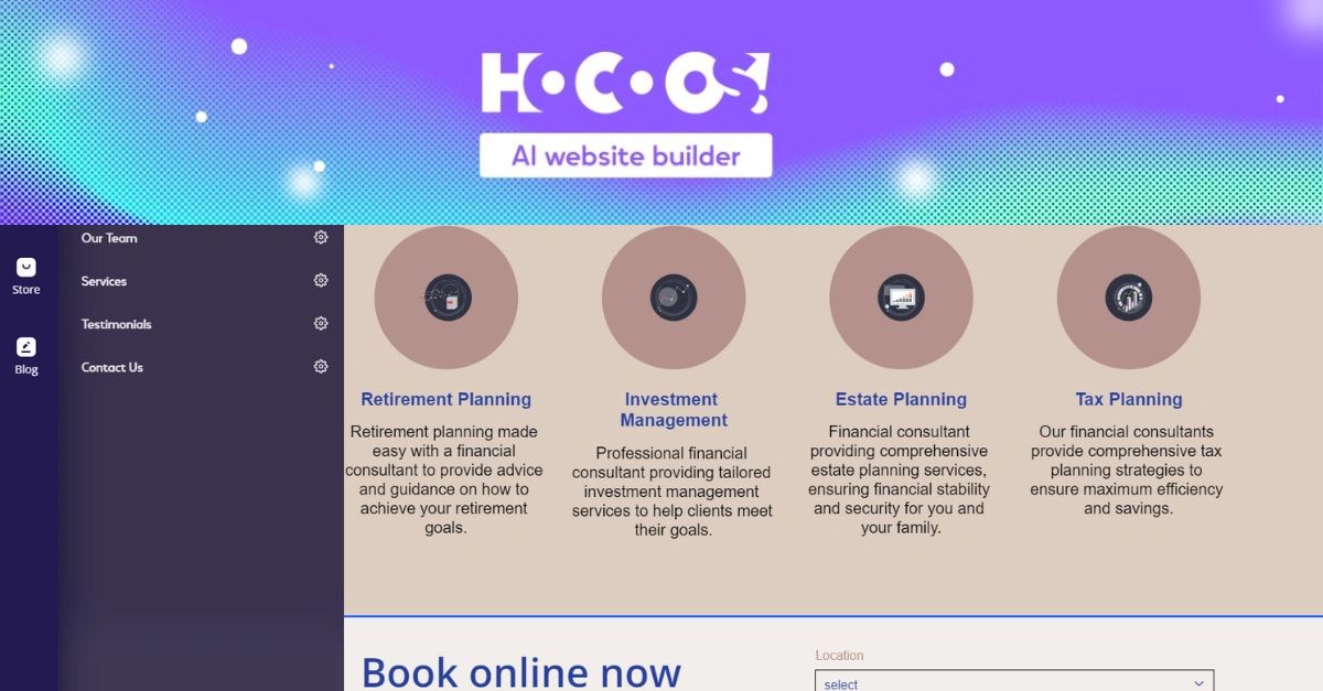 Create a professional website with Hocoos AI Website Builder, no code needed.